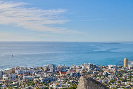 Panorama of Cape Town, South African on bright morning with copy space. Outdoor fresh air with ocean view and cityscape of a busy town in Western Cape, remote getaway destinations in a beautiful city