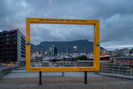 View of Table Mountain through a yellow frame at Victoria and Alfred Waterfront at dusk, Cape Town, South Africa