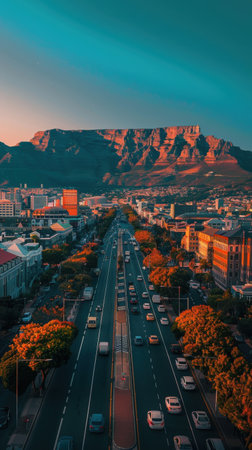 Bright city lights twinkle as the sun sets over Cape Town, casting a warm glow on Table Mountain and the surrounding landscape. The busy urban area showcases a blend of nature and city life
