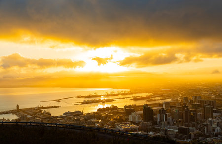 View of Cape Town City at sunrise on a beautiful cloudy morning from Table Mountain, Cape Town, South Africa
