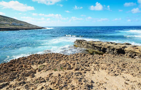 Arikok Natural Park on the island of Aruba in the Caribbean Sea with deserts and ocean waves on the rocky coast