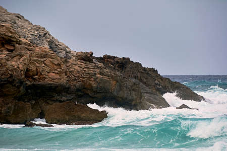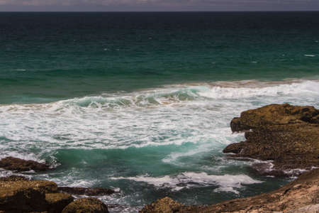 View of strong waves hitting the rock at Sagres, Algarve, Portugal.