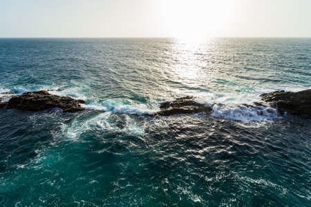Beautiful blue waves of sea or ocean stormy water with white foam or froth splashing and rolling to rocky shore on sunny day on natural background