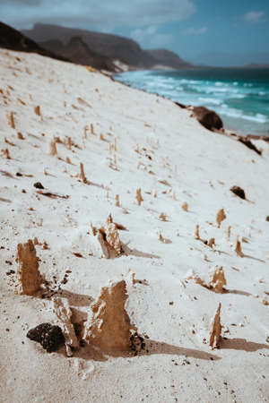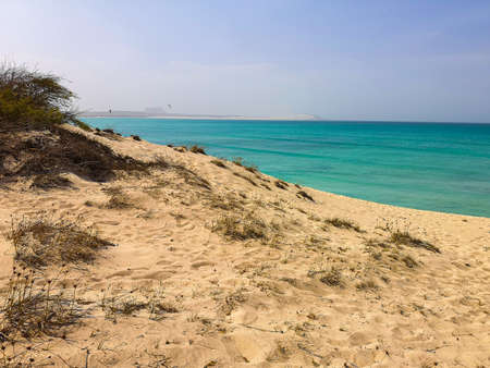 Tropical coastline of Atlantic Ocean, Boa Vista Island, Cape Verde. Sand dunes, clear sky and turquoise color of the water. Selective focus on footprint pattern on the beach, blurred background.