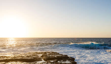waves and rocks at sunset, creamy water and clear skies on a beautiful summer day