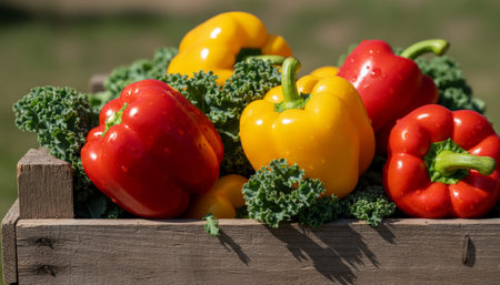 Fresh Vegetables Presented In Charming Marketstyle Setting With Crisp Textures, Vibrant Assortment Of Bell Peppers And Curly Kale Arranged Attractively In Rustic Wooden Container