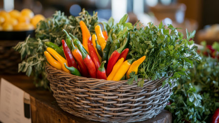 A vibrant basket filled with assorted chili peppers and fresh green herbs showcases farm-fresh ingredients perfect for cooking and healthy meals.