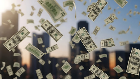 American currency notes are falling from the sky against a backdrop of towering office buildings, suggesting a financial or economic event.