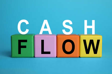 Phrase Cash Flow made with letters and colorful cubes on light blue background
