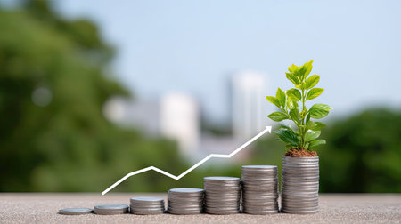 An image presents a financial growth concept, featuring stacks of coins with plants on top. A dark arrow pointing upwards symbolizes progress. The scene is illuminated by soft light in a blurred indoor setting, possibly an office, suitable for business presentations or financial articles.