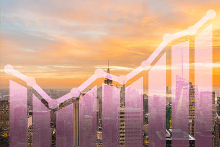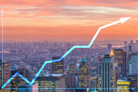Multi exposure of abstract financial diagram and upward arrow on Manhattan office buildings background, rise and breakthrough concept