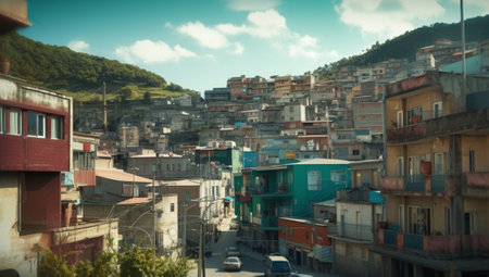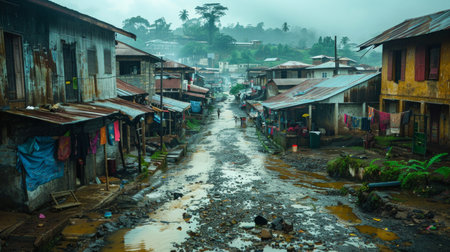 A striking view reveals luxurious villas adjacent to dilapidated shanties, highlighting social inequality in the urban landscape.