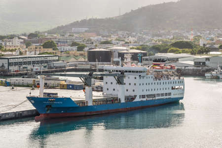 Port Louis, Mauritius - December 25, 2015: Passenger Cargo Ship Mauritius Trochetia in the morning haze in Port Louis, Mauritius.