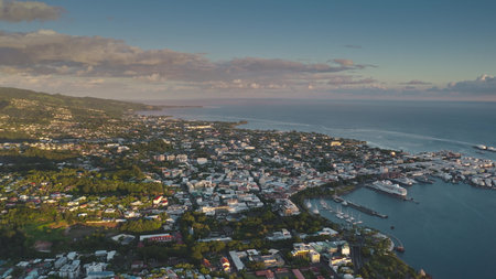 Aerial view of Papeete, the capital city of French Polynesia, showcasing its harbor, cityscape, lush greenery, and the vast pacific ocean during the golden hour