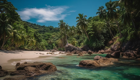 A tranquil scene of turquoise waters, palm trees, and relaxation generated by artificial intelligence