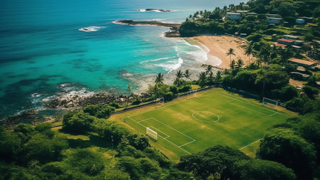Generative AI : Aerial view of a small football field in a residential district of Mudanya a small town along the Marmara Sea coastline Bursa Turkey