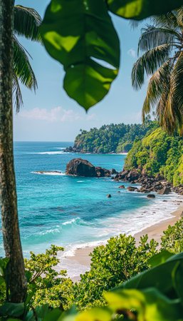 A breathtaking coastal view showcasing calm turquoise waters, rocky shores, and lush greenery under a partly cloudy sky, perfect for nature lovers and travelers.
