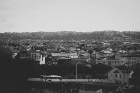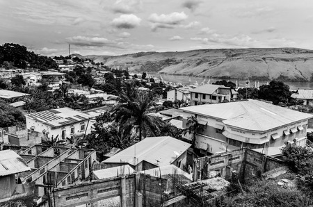 The Congolese town Matadi at the Congo river in black and white. The city is built over several hills with wildly varying architecture.