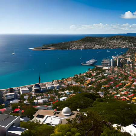 Breathtaking aerial view capturing Papeete vibrant cityscape along the pacific ocean, with a bustling harbor and a distant coral reef enhancing the tropical paradise