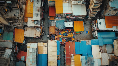 A birdseye view of a beach with colorful umbrellas and tents, surrounded by water and an urban design landscape. Perfect spot for leisure and recreation in the city AIG50