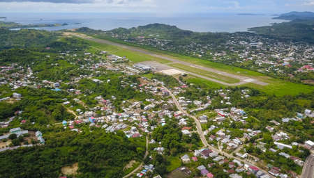 Aerial view of airport runway at Labuan Bajo, Flores, East Nusa Tenggara, Indonesia, surrounded by mountains with clear blue sky and beautiful clouds