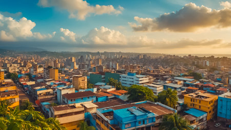 This vibrant aerial image captures Dar es Salaam's scenic waterfront showcasing unique architecture, busy streets, palm trees, and boats on the harbor.