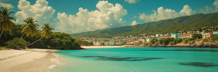 Panoramic view of beautiful beach with palm trees, rocks and turquoise sea in the background