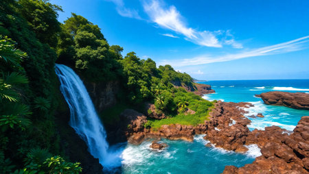 A vibrant coastal landscape showing verdant foliage along rugged rocks, set against a spotless azure sky and gentle turquoise waters.