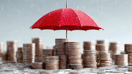 A vibrant red umbrella shields carefully arranged coins from a rainstorm, conveying stability and safety amid unpredictable financial climates with softly blurred currenc