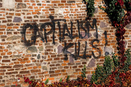 Capitalism Kills Graffiti On Brick Wall With Ivy