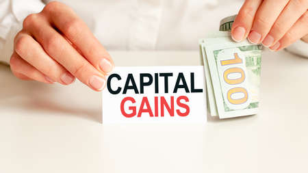dollars bill, white notepad sheet on the white background. CAPITAL GAINS text. Finance and economics concept. Finance concept.