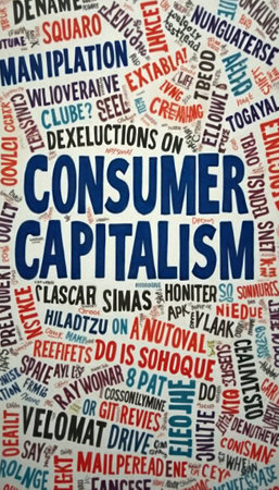 A vibrant and chaotic collage of various words and phrases encapsulates the essence of consumer capitalism, drawing attention to its multifaceted nature. The bold title CONSUMER CAPITALISM stands out prominently, surrounded by a whirlwind of terms that provoke thought and discussion about modern economic practices and societal impacts.