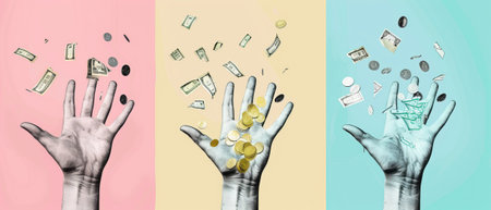 Featuring hands holding money elements in a halftone effect. Retro illustration with doodles of dollars on a white background. Available as a trendy png file..