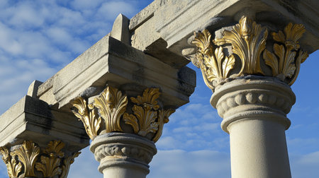 Captivating view of elegant pillars featuring ornate capitals under a blue sky, showcasing the intricate craftsmanship and historical beauty of architecture.