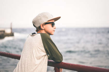Beautiful smiling teen relaxing leaning against a railing near the sea, looking away with sun glasses and trendy hat. Young boy enjoying last summer days in front of the ocean. Youth, positive concept