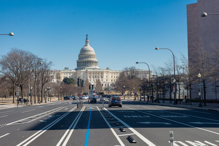 View of the Capitol from Pennsylvania Avenue. Bike path with markings on the road. Washington, DC