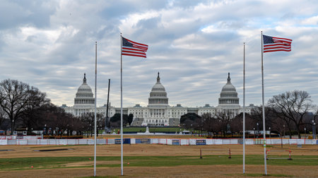 Congress in Washington, DC. The Capitol dome over Capitol Hill. Washington, DC landmark. American flag above the Congress. Washington DC skyline. Senate and House in Washington, DC.