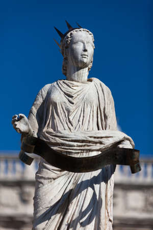 Ancient Sculpture Madonna Verona on Piazza delle Erbe - the town's forum during the time of the Roman Empire. Palazzo Maffei in the background