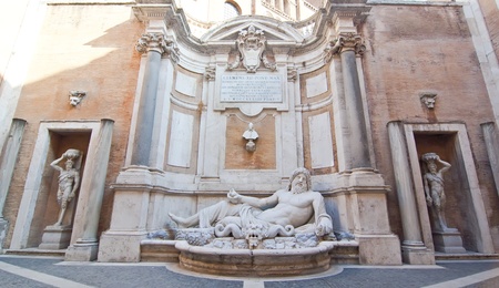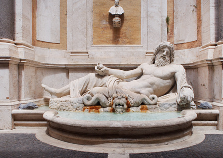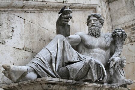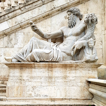 Ancient marble statue of River Tiber god protects Romulus and Remus With His right arm, from Capitoline Hill Square, in the center of Rome