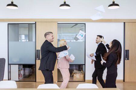 Cheerful business people sitting in office boardroom and throwing papers in midair over conference table