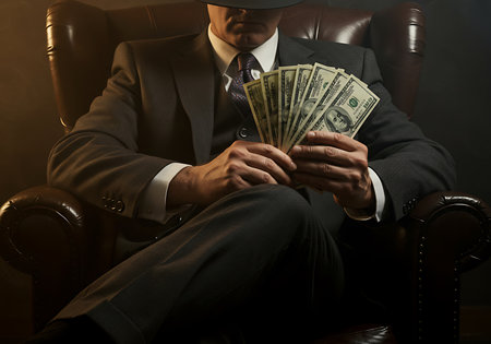 A man in a classic 1920s-style suit and fedora, seated in a dark leather armchair, confidently holds a wad of US dollars. Generative Ai