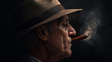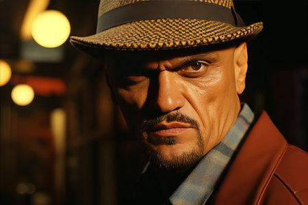 dramatic closeup portrait of Italian Chicago gangster, mafia boss in hat. Organized crime, mafia