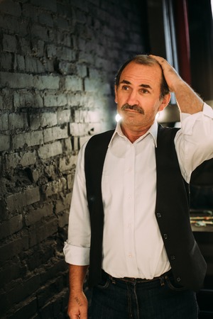 Handsome middle aged man is dressed in a white shirt and a black vest. Black background.