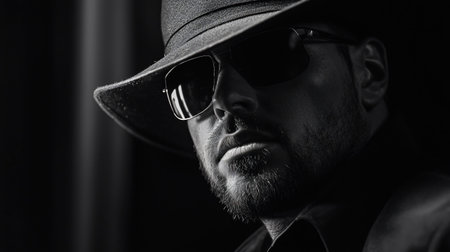 A striking black and white portrait of a man wearing a hat and sunglasses, exuding an air of mystery and sophistication.