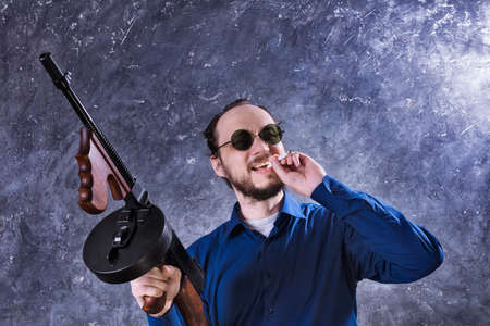 Mature man in sunglasses with tommy gun