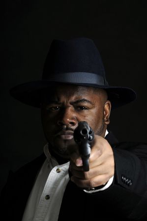 young African American man in a hat and suit with a gun pointed at the camera