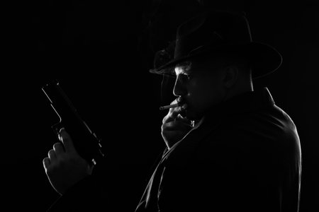 Old fashioned detective with gun smoking cigarette on dark background, black and white effect