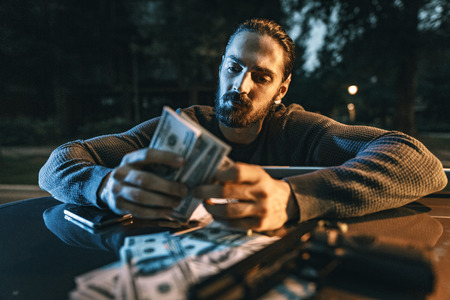 Dangerous criminal man is holding a gun and counting the money after criminal job done.