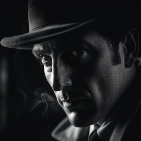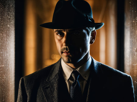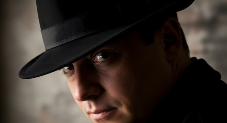 Vintage detective wearing fedora in shadowy setting looking mysterious and retro. Concept Retro Detective, Fedora Hat, Shadowy Ambiance, Vintage Style, Mysterious Look