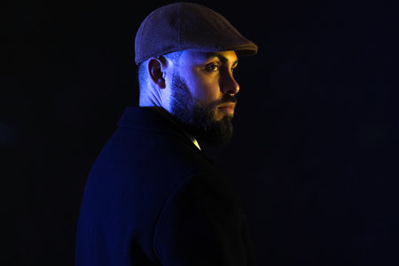 Silhouette of young bearded man in cap on dark background